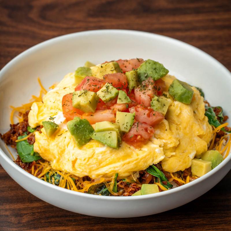 Meats and vegetables layered over hashbrowns topped with three eggs any style* and toast or pancakes • Substitute Gluten Free Pancakes +$1.50